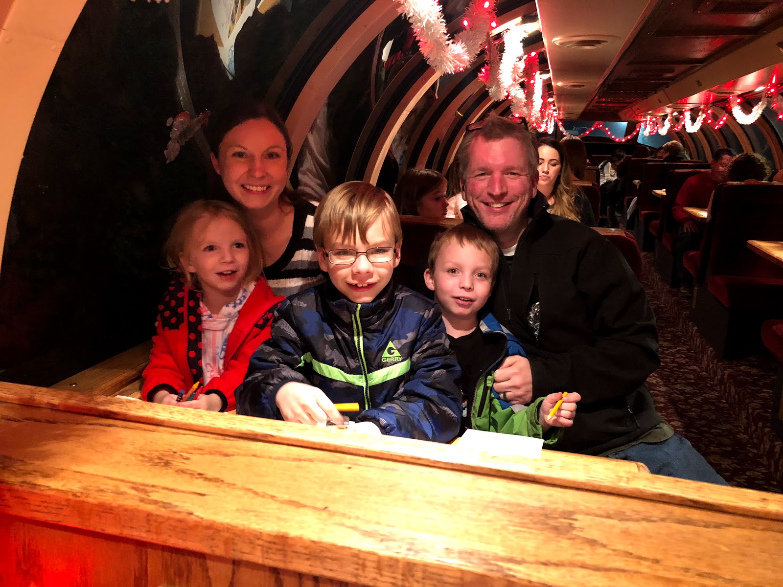 | Family Picture taken by one of the fun elves. When we bought the tickets they tried to sell us a dinner package. It was overpriced and not a lot of food my kids would eat so we declined. What I didn't realize is that half the fun on this trip is eating. Everyone else was ordering food, drinks, etc. We had just stopped and McDonald's on our way and filled up so we didn't need anything. I felt bad because the elves were our servers and I'm guessing they were hoping for a tip from our two tables. But um....yeah. Not paying $25/person for food after already dropping serious cash on the tickets themselves. Oh well. We still had a great time, I just felt a tad guilty. |